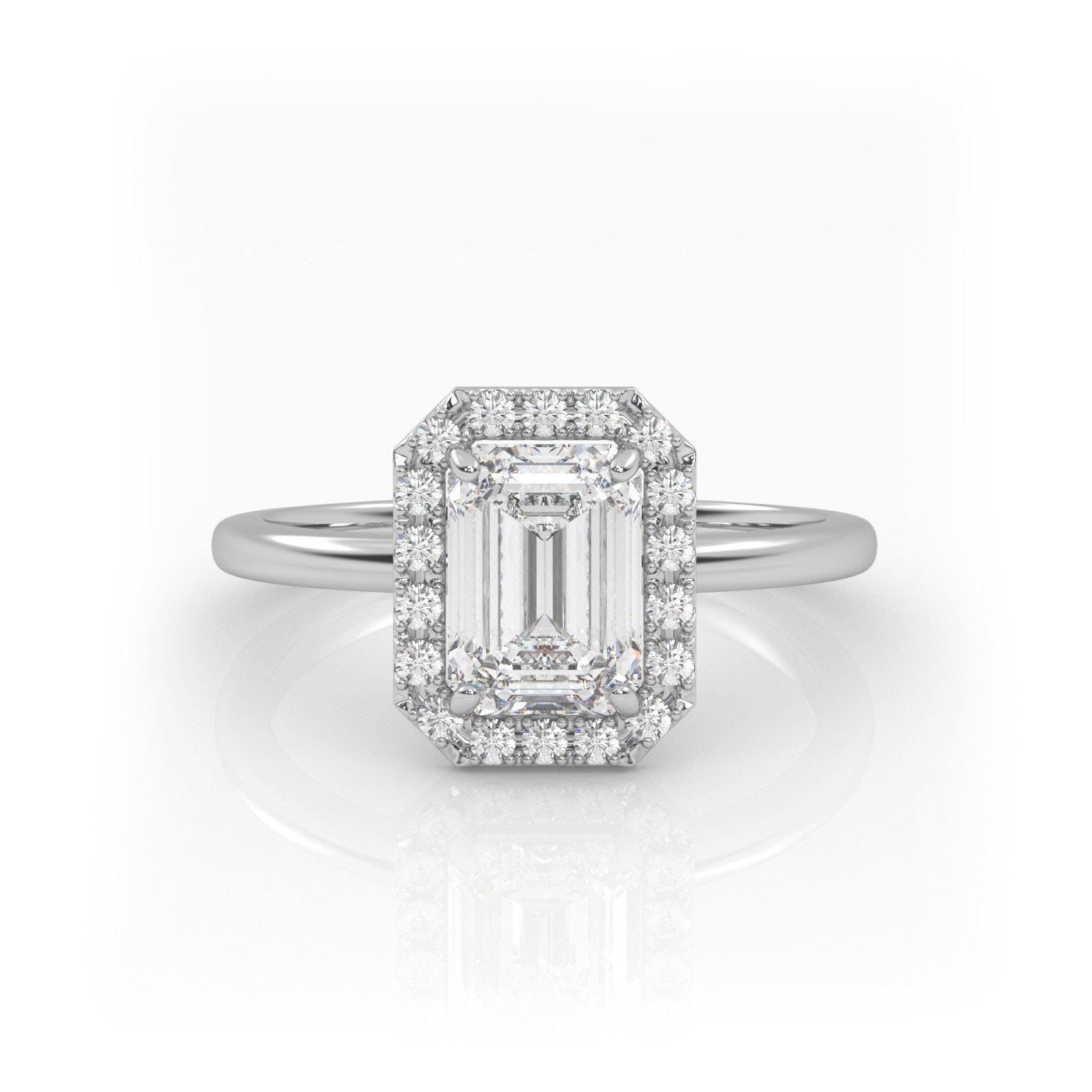 Enchant your beloved with the timeless beauty of our 18K Rose Gold Emerald Diamond Engagement Ring. Embrace the mesmerizing allure of the emerald cut diamond in a Solitaire and Halo style setting. The captivating design exudes luxury and sophistication. The plain band add a touch of elegance, perfectly complementing the center stone. Make this exceptional ring a symbol of your everlasting love and devotion.